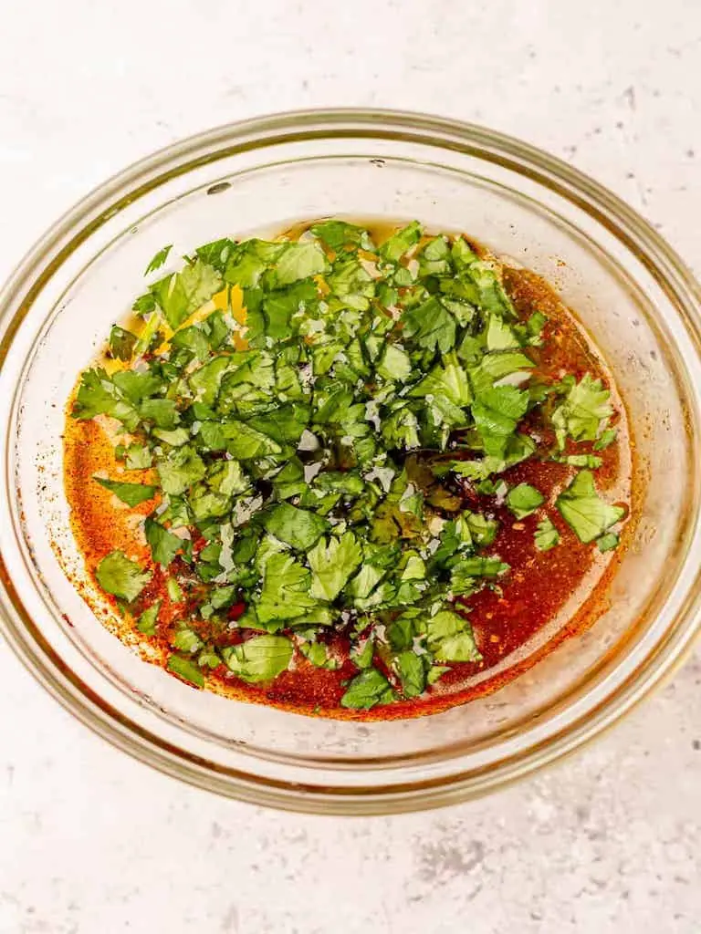 In a smaller bowl or jar, mix together Olive Oil (4 Tbsp), Lime Juice (1), Salt (1 tsp), Ground Black Pepper (1/2 tsp), Paprika (1/2 tsp), Cayenne Pepper (1/4 tsp), and Fresh Cilantro (2 Tbsp).