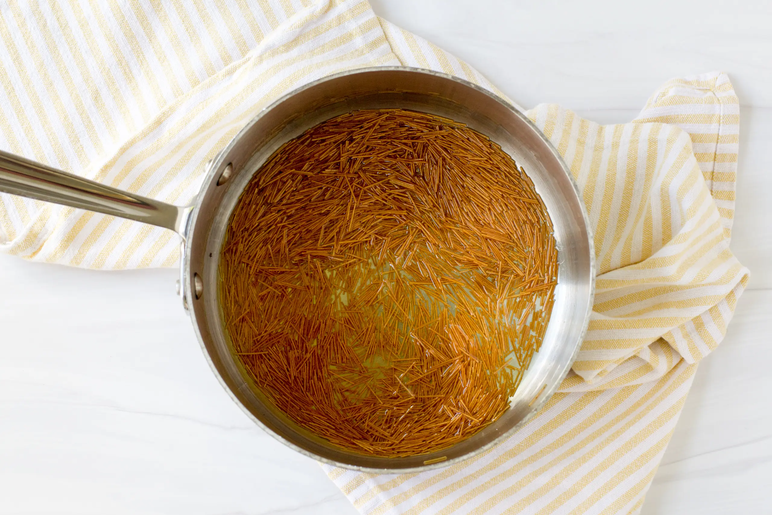 Add the Ghee (3 Tbsp) to a medium saucepan and heat over medium heat until melted. Add the Vermicelli Noodles (1/2 cup) and toast, stirring frequently, until golden brown, 2 to 3 minutes.