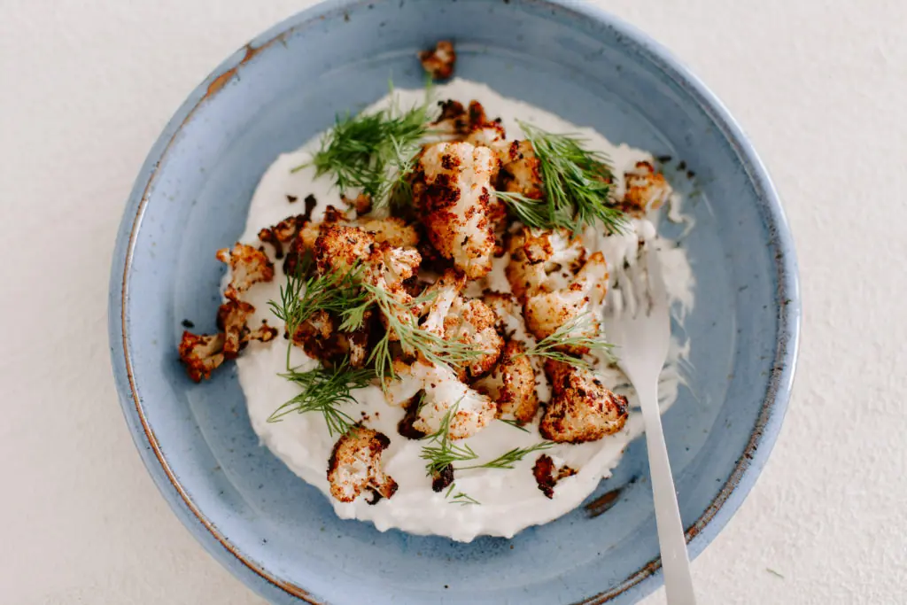 While your cauliflower is roasting, whip your feta. Grab your stand mixer or mix by hand with a whisk, and add your Feta Cheese (1 1/2 cups), Garlic (1 clove), and a splash of your Olive Oil (1 tsp). Mix until smooth and combined. Then, season with your Sea Salt (to taste) and Freshly Ground Black Pepper (to taste), and top with Fresh Dill (to taste).