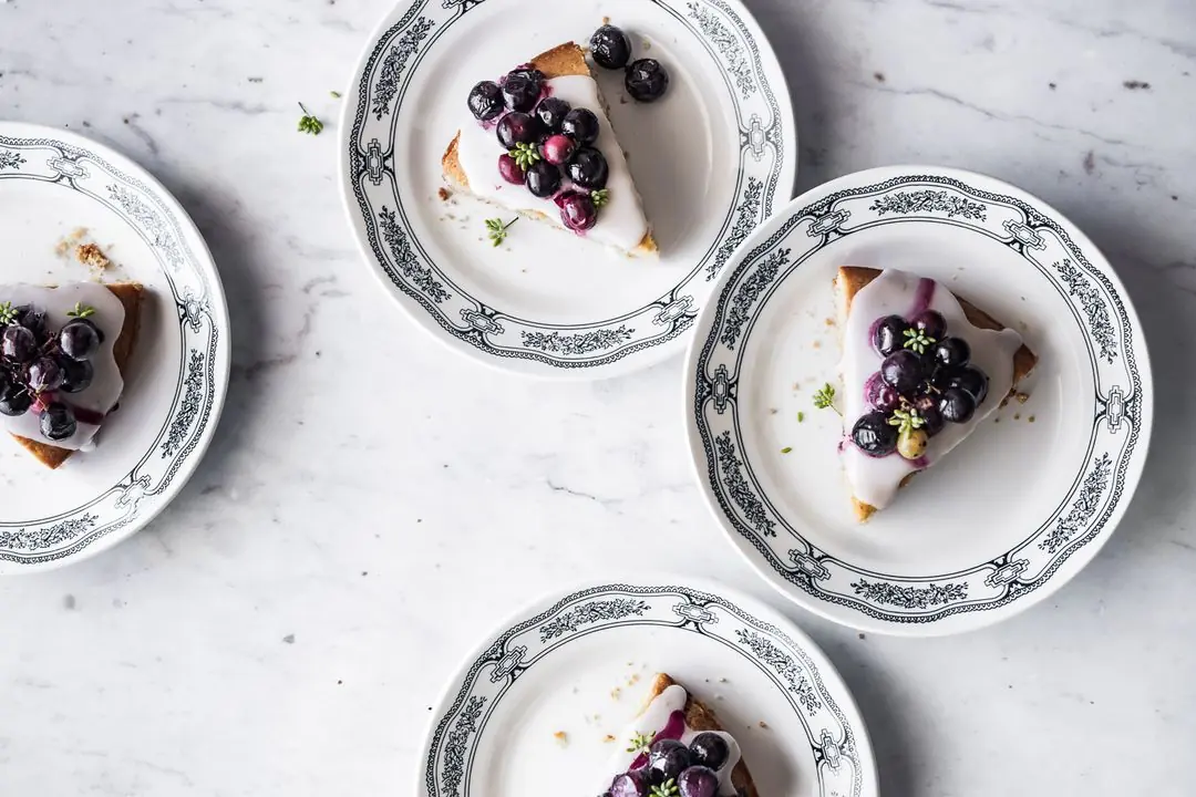 Allow the glaze to air dry for about 15 minutes before arranging the grapes on top of the cake. Garnish with young wild fennel seeds if you have access to them and serve.