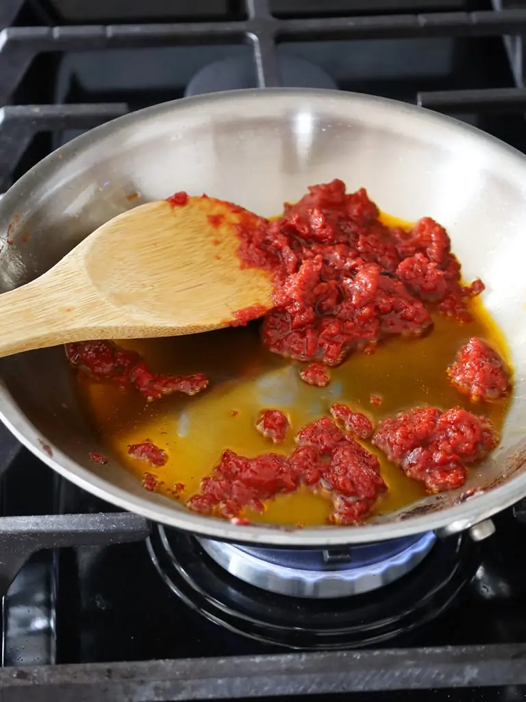 Cook, breaking up the tomato paste with a wooden spoon and scraping the bottom of the skillet until the oil is bright orange and the tomato paste has darkened in color, 2-3 minutes. Set aside to cool slightly.