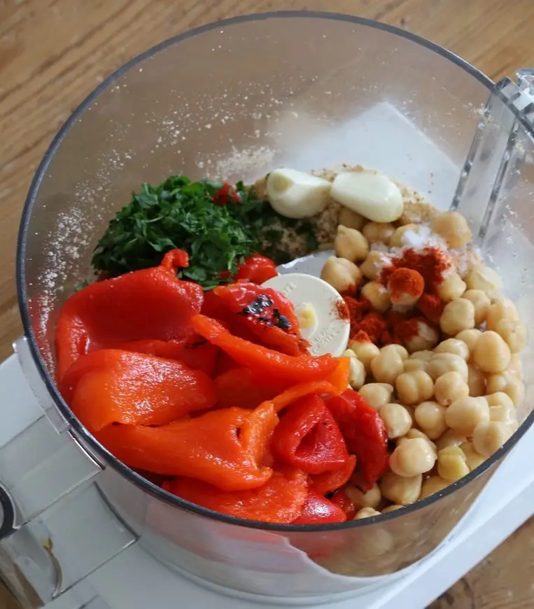Using a rubber spatula, scrape the tomato paste and oil mixture into the food processor. Process or blend on high, adding more liquid from the jar of peppers (or water) if the hummus is too thick, until smooth and creamy.