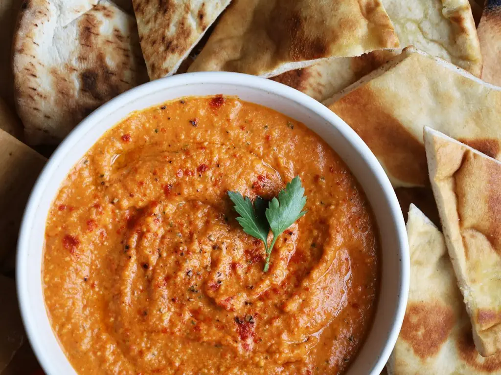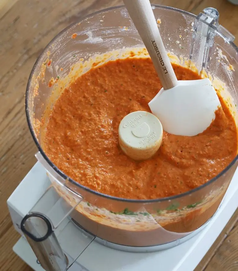 This spin on traditional Middle Eastern hummus is inspired by Romesco, a smoky Spanish sauce made from pureed roasted red peppers, tomatoes, garlic, almonds, bread crumbs, and plenty of olive oil. It’s great with everything from grilled steak to roast chicken to shrimp, white fish, salmon, and grilled vegetables. And yes, it even makes incredible hummus!