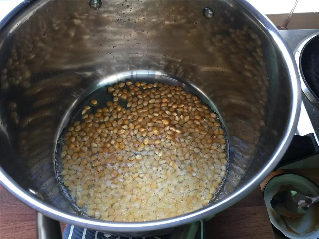 Count to 30 seconds before adding the remaining Popcorn Kernels (1/2 cup). Carefully toss them around so they are coated in the oil. Cover and place back over medium heat.