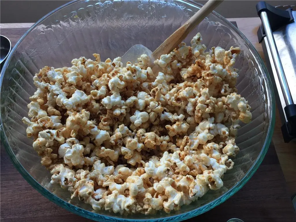 In a large mixing bowl, add the caramel and popcorn together in batches and fold together using a rubber spatula.