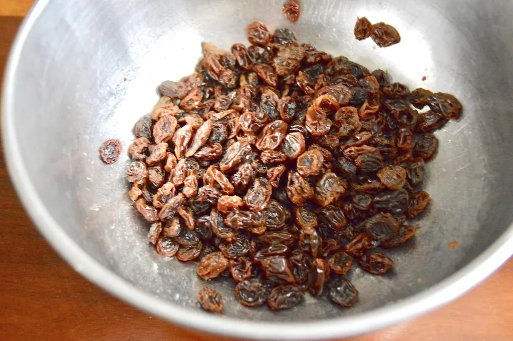 Put the Sun-Maid Raisins (1 cup) in a medium saucepan and add enough water to submerge them. Bring the water to a boil and let the raisins plump up in it. Then drain them and transfer them to a bowl.