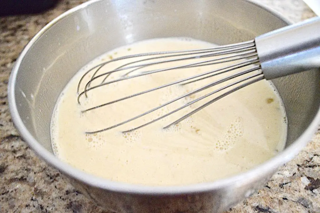 When the milk is gently bubbling, slowly whisk it into the eggs. Do just a little at first so that the eggs do not scramble. Once you have whisked in all of the milk, whisk in the Vanilla Extract (1 Tbsp). Then the custard is done and it is time to assemble everything.
