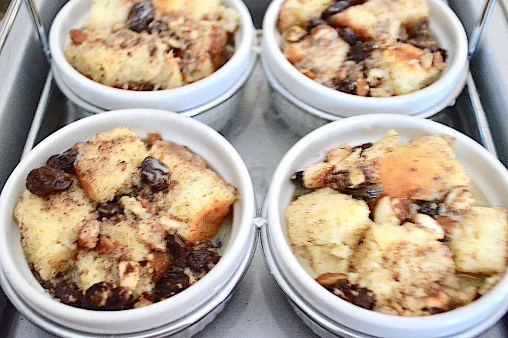 Preheat the oven to 300 degrees F (150 degrees C) and get out 8 individual ramekins. Divide the bread mixture evenly among the eight ramekins. Then evenly pour the custard over the bread in each ramekin. It takes roughly 2/3 of a cup per ramekin.