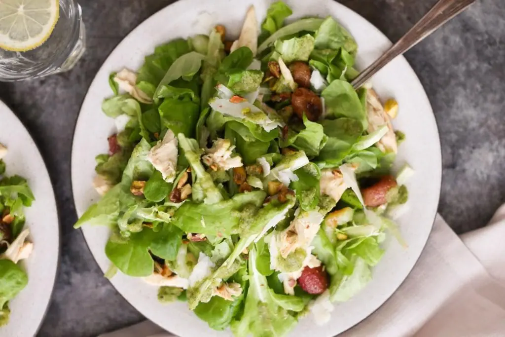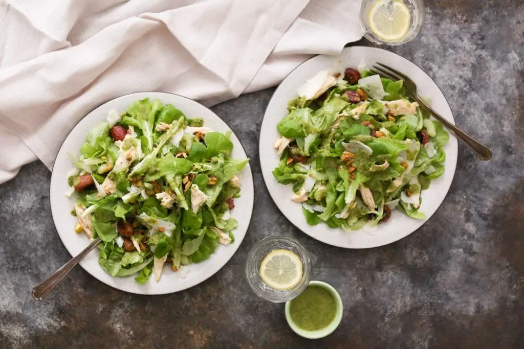 Place the Boston Lettuce (4 cups) in a mixing bowl. Add the Roasted Chicken (1 cup), roasted grapes, and Celery (1 stalk), and toss gently to combine. Dive the mixture between to large plates or bowls. Top each salad with Manchego Cheese (4 Tbsp) and Pistachios (3 Tbsp). Drizzle each salad generously with the desired amount of dressing.