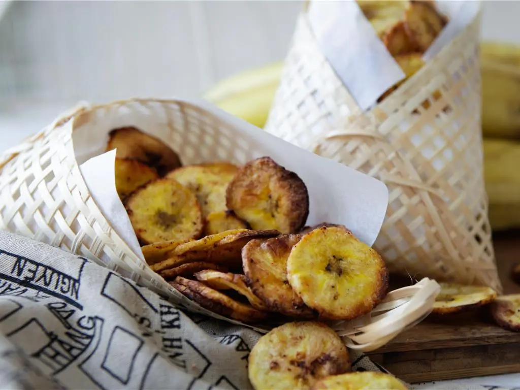 These baked plantain chips can be made ahead and stored in an airtight container for 2 days where they will remain crisp and crunchy.