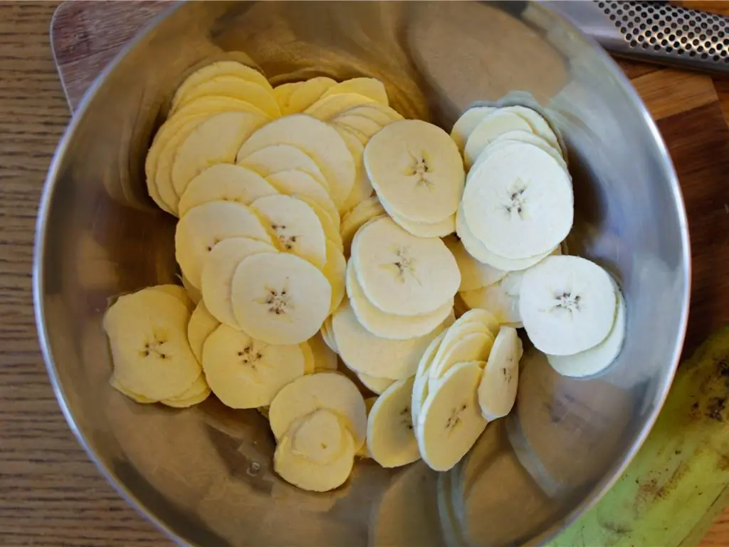 Using a mandoline, slice the plantain thinly.