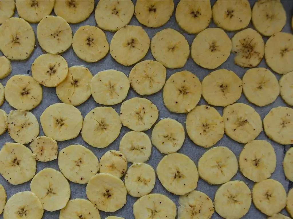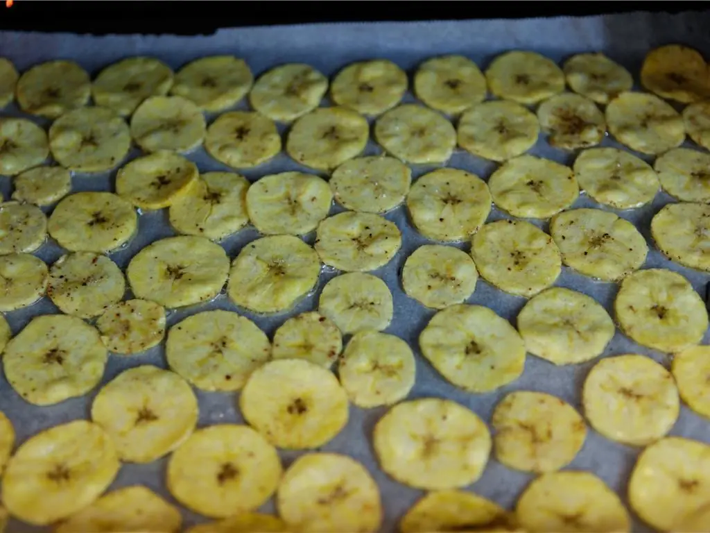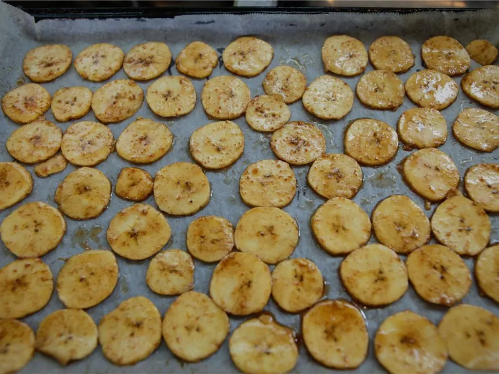 Layer the plantain on the baking tray, they will stick to each other if they overlap so make sure they have a little room.