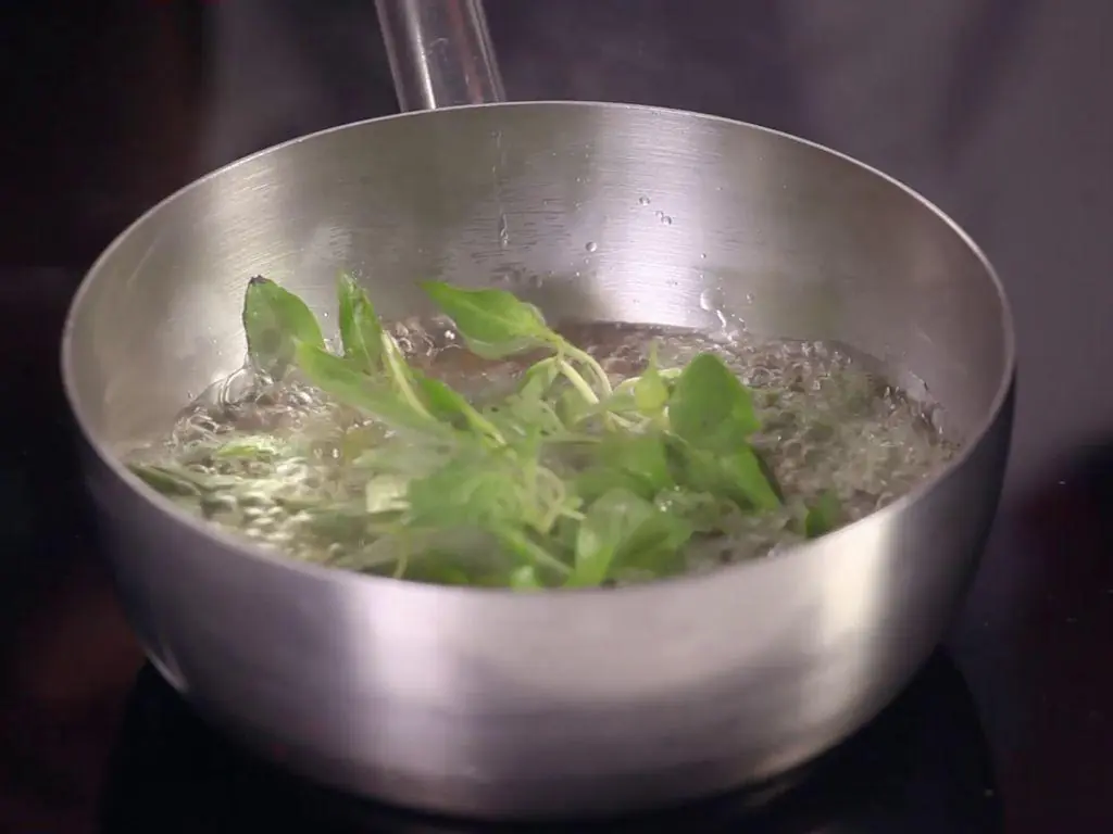 In a pan, sauté Fresh Basil Leaf (1/2 cup) and Fresh Cilantro (4 sprigs) in Cooking Oil (1 Tbsp) in a pan on high heat.