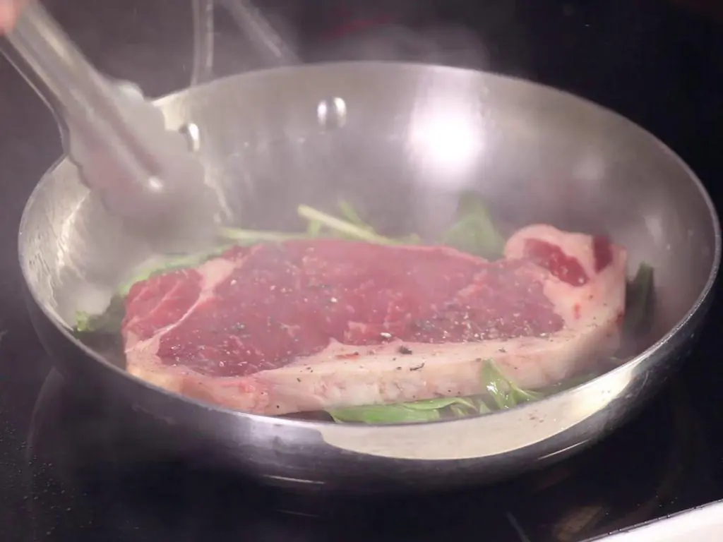 Add the Steak (9 oz) on top of basil leaves and cilantro to sear. Flip the steak. Keep on high heat until it turns brown.