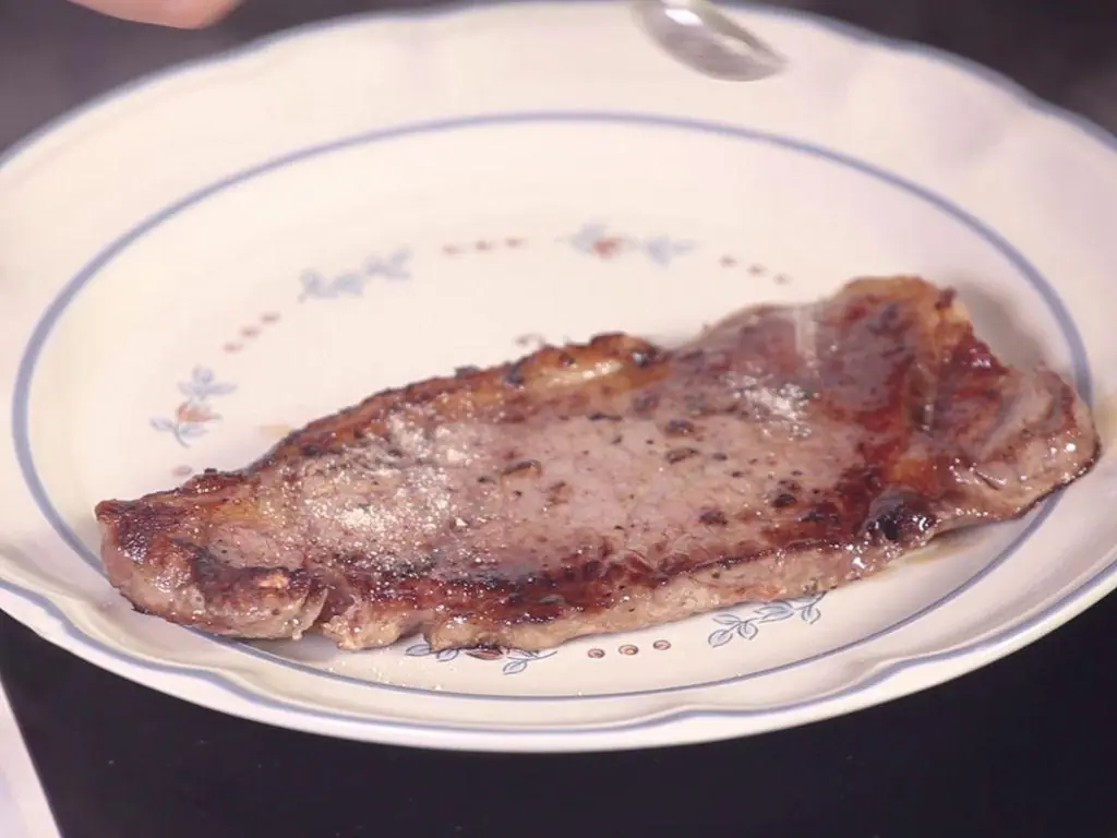 Place the steak on a plate. Sprinkle Roasted Rice Powder (3 1/2 Tbsp) on the steak.