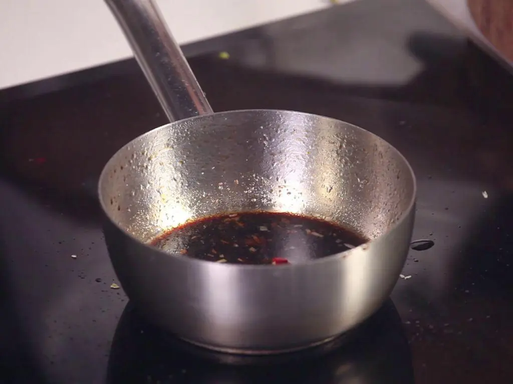 Use a small pot to prepare the sauce: Sauté Garlic (1 clove), Red Chili Pepper (1), and Long Green Peppers (1/2) in hot Cooking Oil (1 tsp).