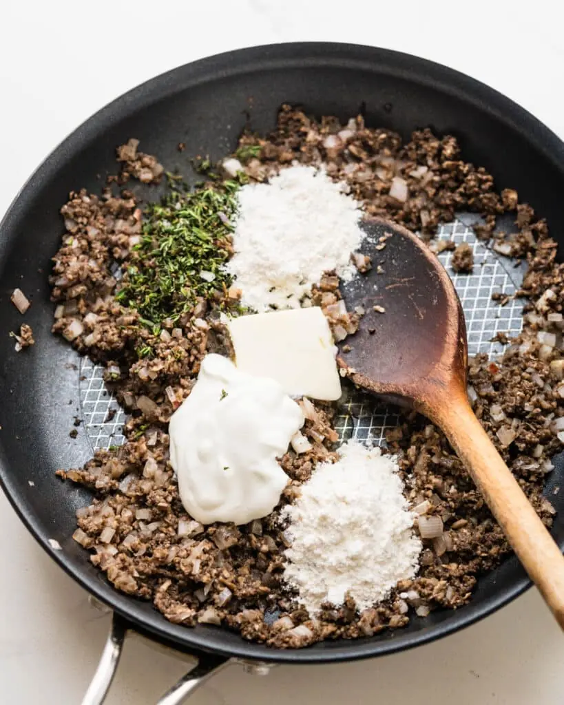 Stir in the Sour Cream (4 Tbsp), Salt (1 tsp) and Dried Thyme (1/4 tsp). Cook for about a minute until thickened and remove from heat to cool.