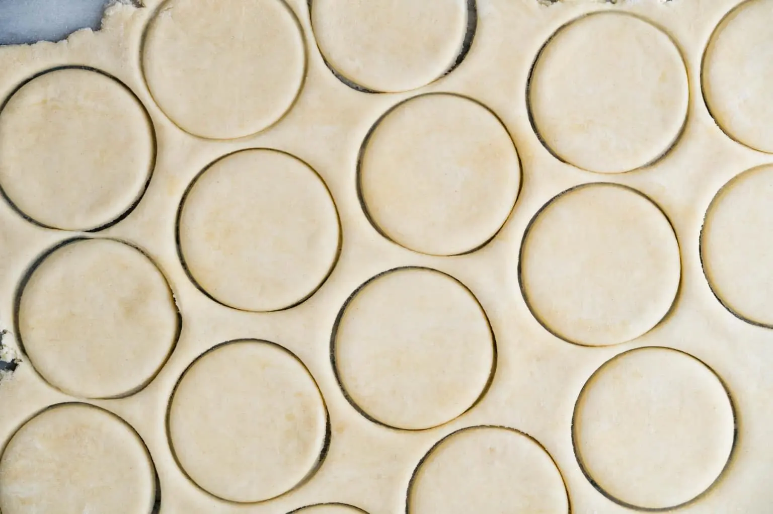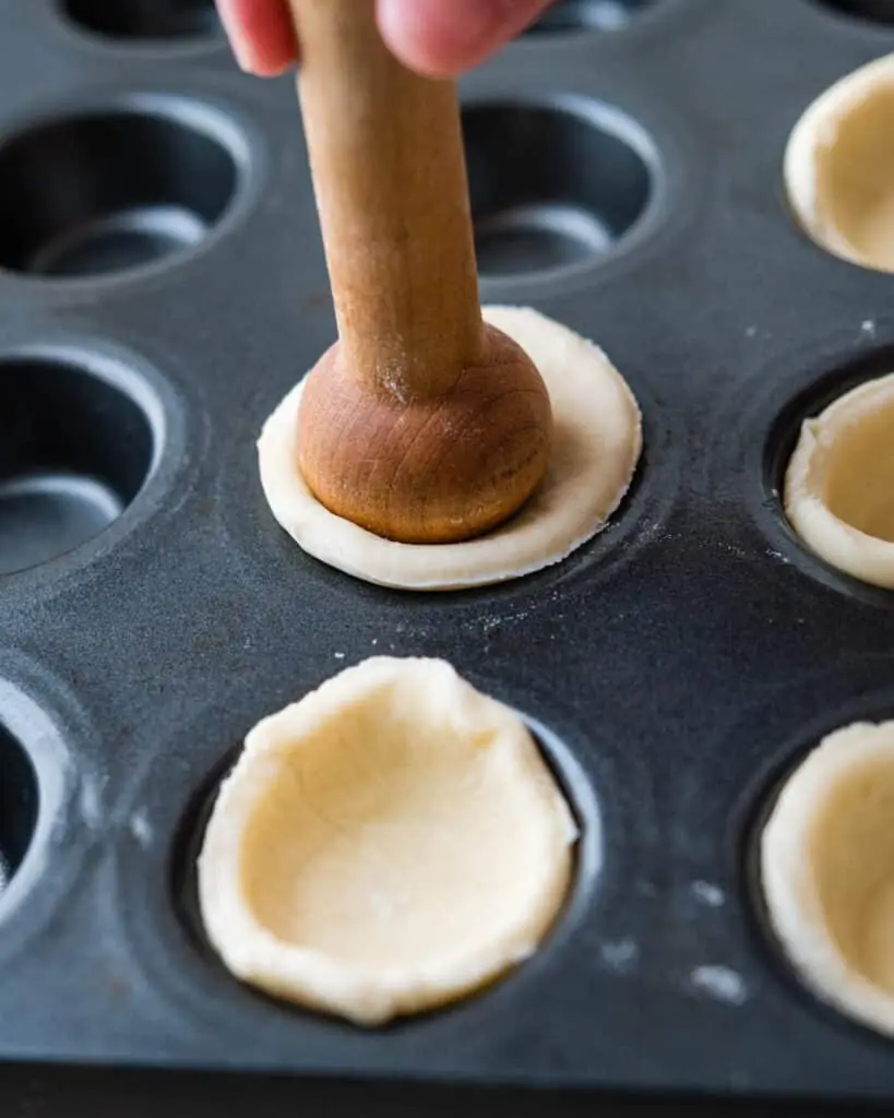 Meanwhile, roll out the dough and cut into about 2 3⁄4-inch circles and press into a mini muffin pan.