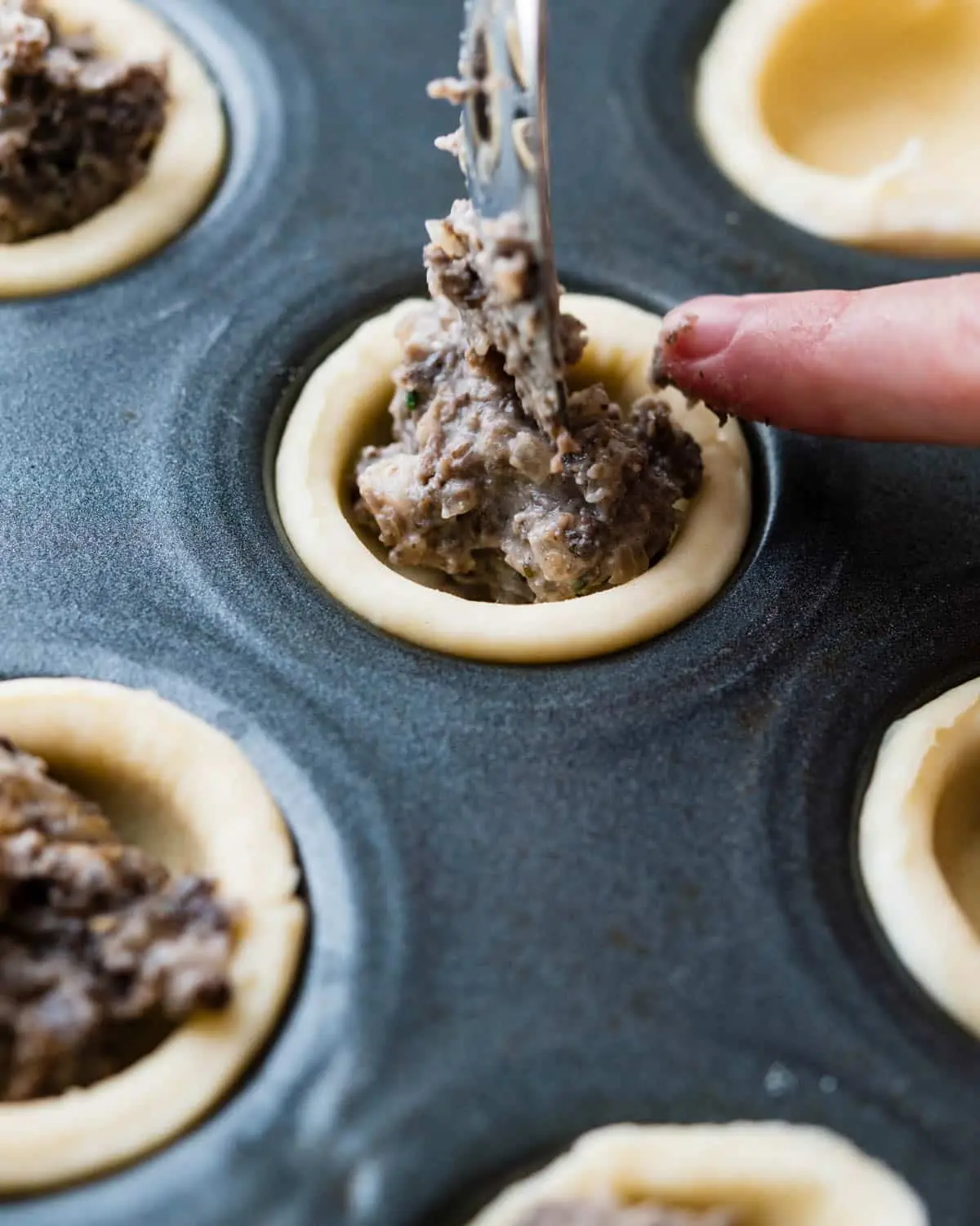 Fill the pastry cups with 1 teaspoon of mushroom filling.