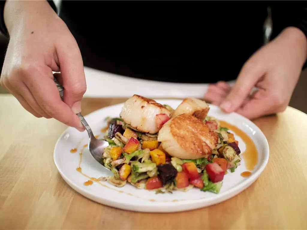 "New England is famous for its plentiful, crisp, juicy apples... You’ll reduce cider and make a delicious syrup to drizzle over sweet, tender, seared scallops, combined with earthy potatoes, two types of beets and tender Brussels sprouts." - Chef Leo Bushey III of the Madison Beach Hotel.
