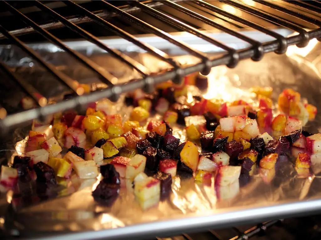Lay beets and potatoes in a single layer on a foil-lined sheet pan and roast in the oven for 30 minutes. Rinse and pat dry bowl.