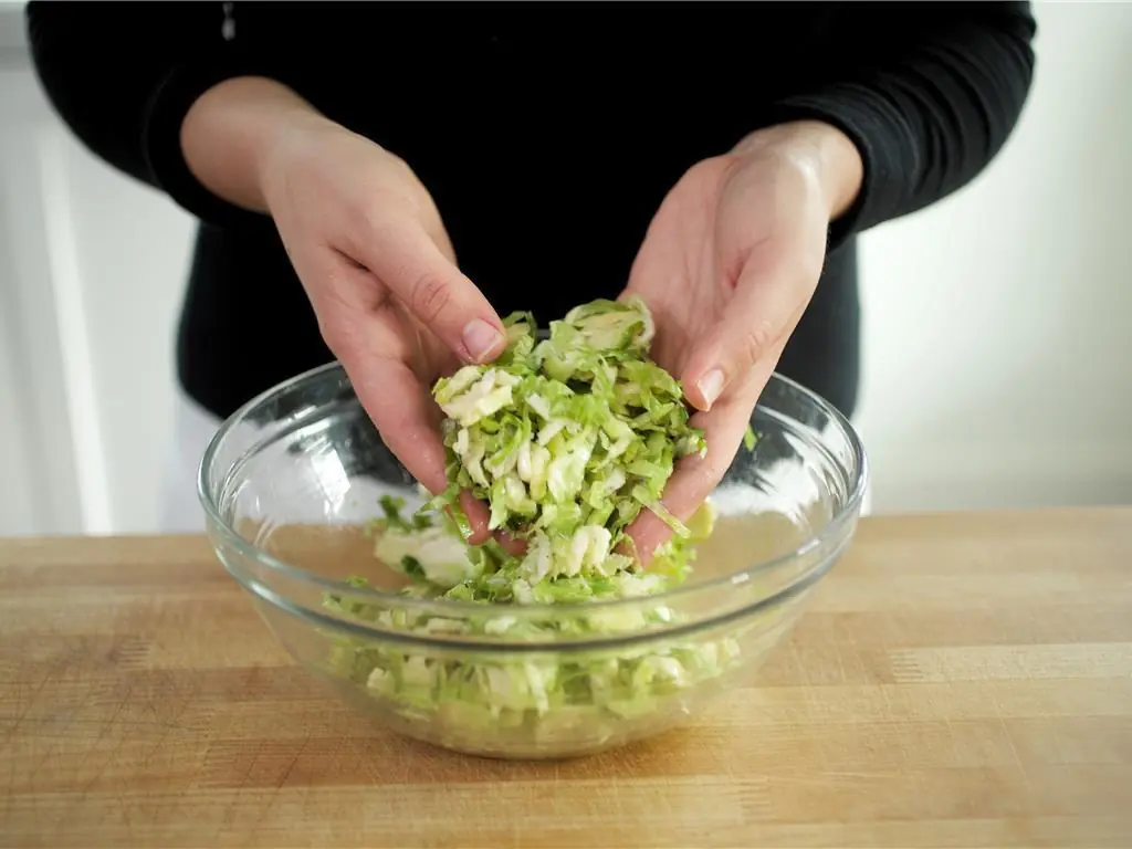Meanwhile, cut Brussels Sprouts (2 1/2 cups) in half, then slice into quarter inch shreds with the flat side down. Place the sprouts in a medium bowl with Olive Oil (1 Tbsp), Salt (1/4 tsp), and Ground Black Pepper (1/4 tsp).