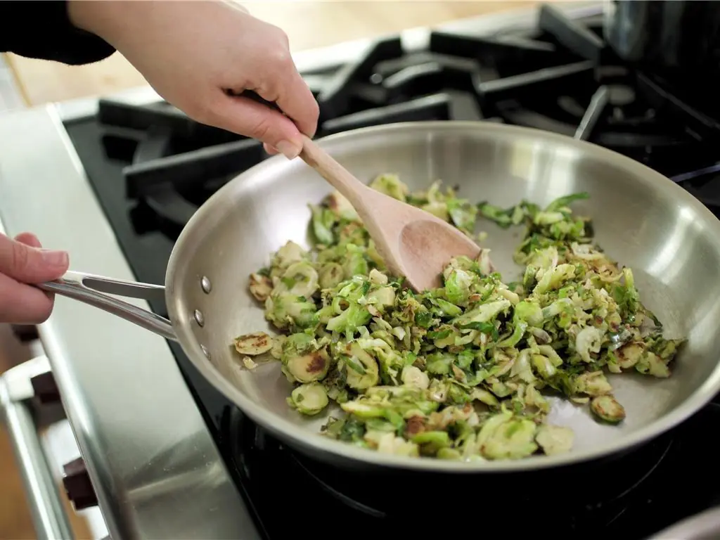 Heat a medium saute pan over medium-high heat, add Olive Oil (1 Tbsp). Once pan is hot add the Brussel sprouts and a pinch of salt and a pinch of pepper. Cook for 5 minutes, and set aside.