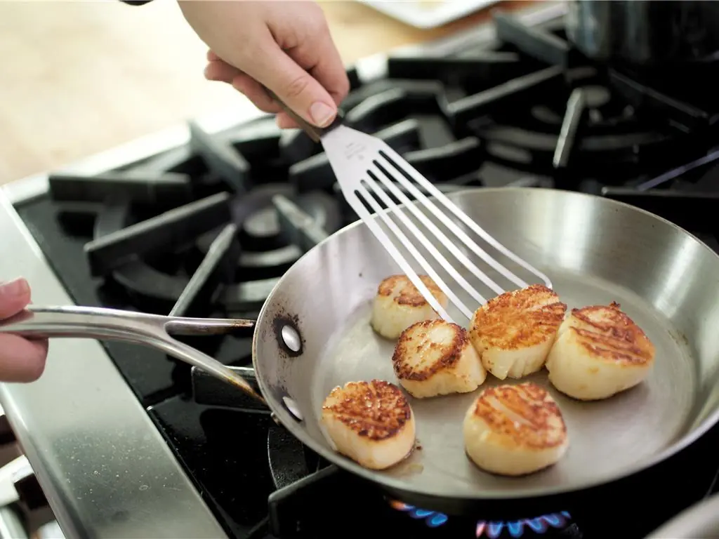Turn scallops over and cook for 1 minute. Remove from heat and hold until plating.
