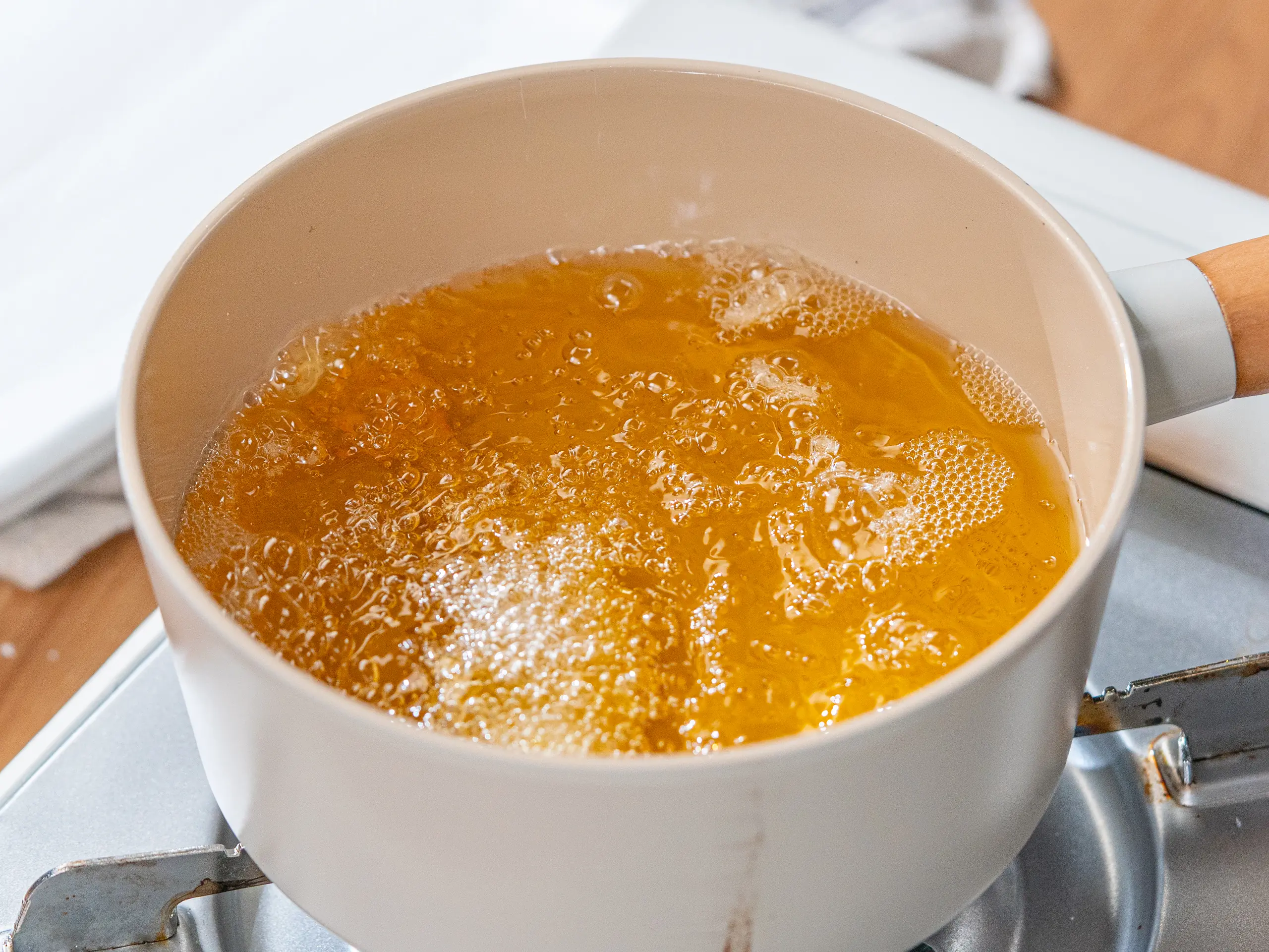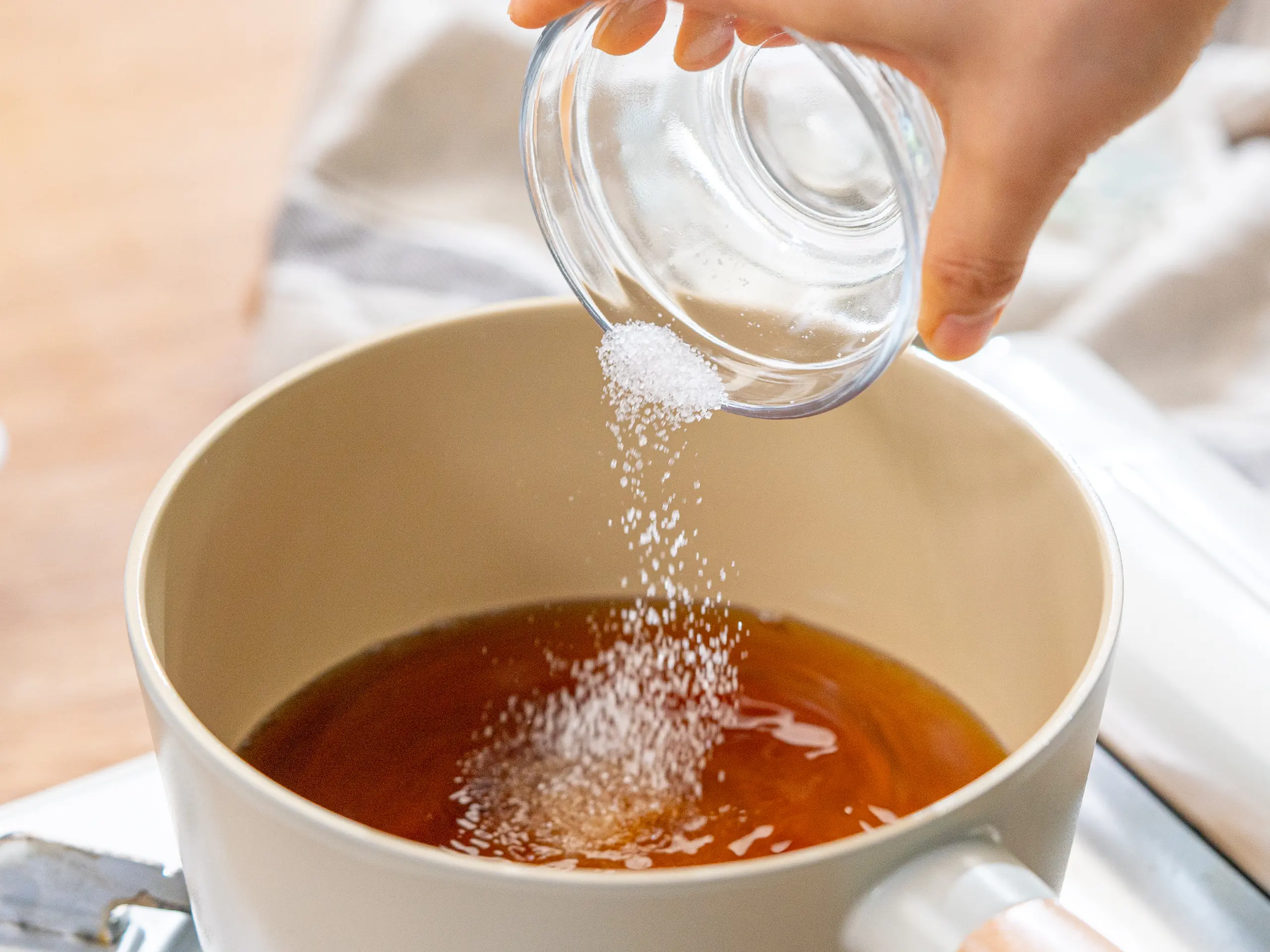 In a saucepan, mix Hondashi (1 tsp) and Water (3/4 cup), Soy Sauce (3 Tbsp), Mirin (3 Tbsp), and Granulated Sugar (2 tsp) over medium heat. Cook until the sugar has just dissolved. Set aside.