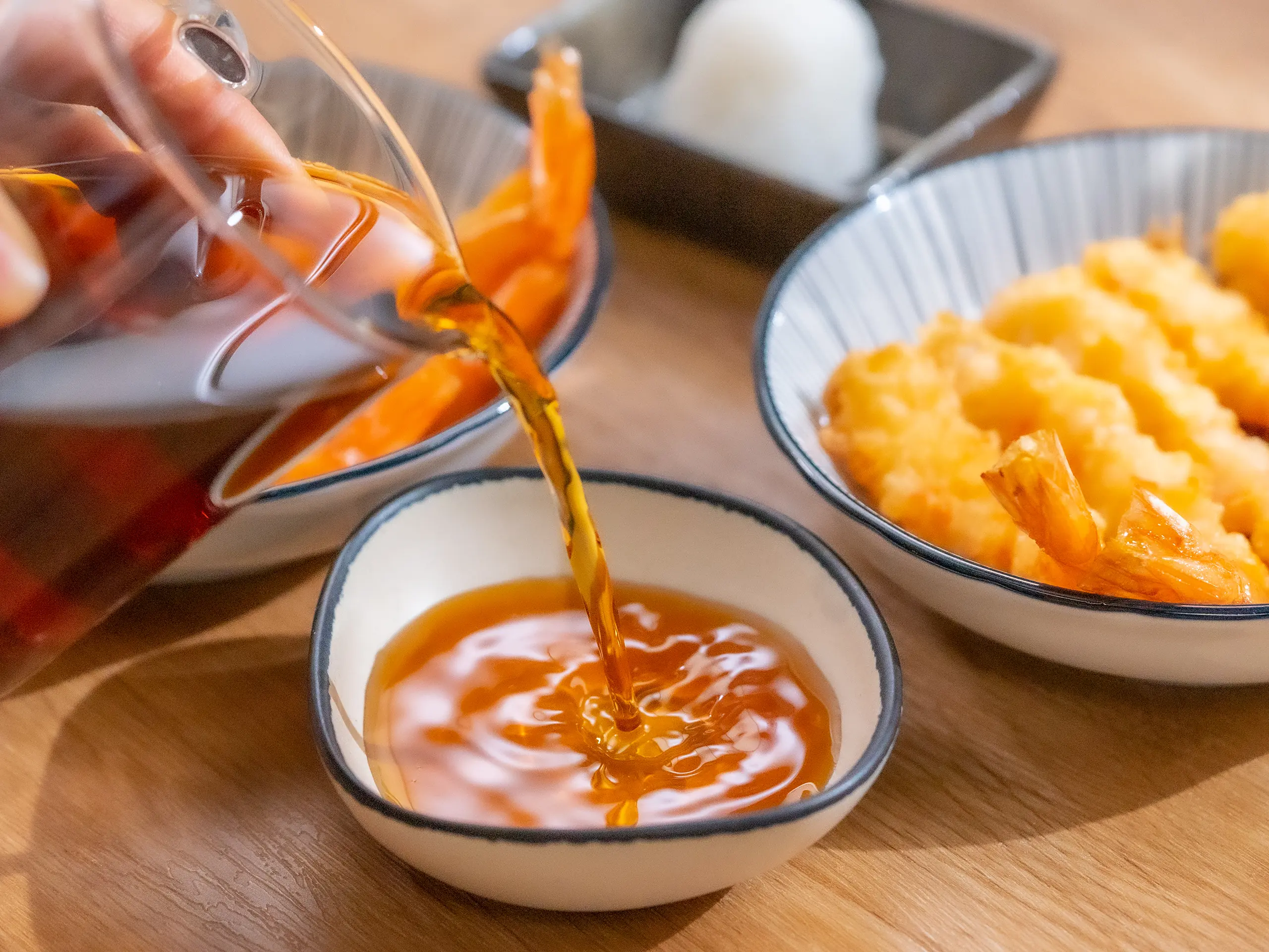 Serve the shrimp tempura with tempura dipping sauce and grated Daikon Radish (1) on the side.