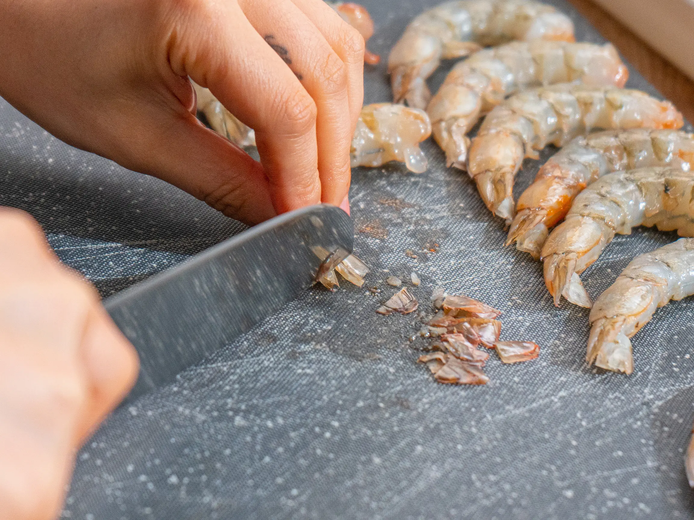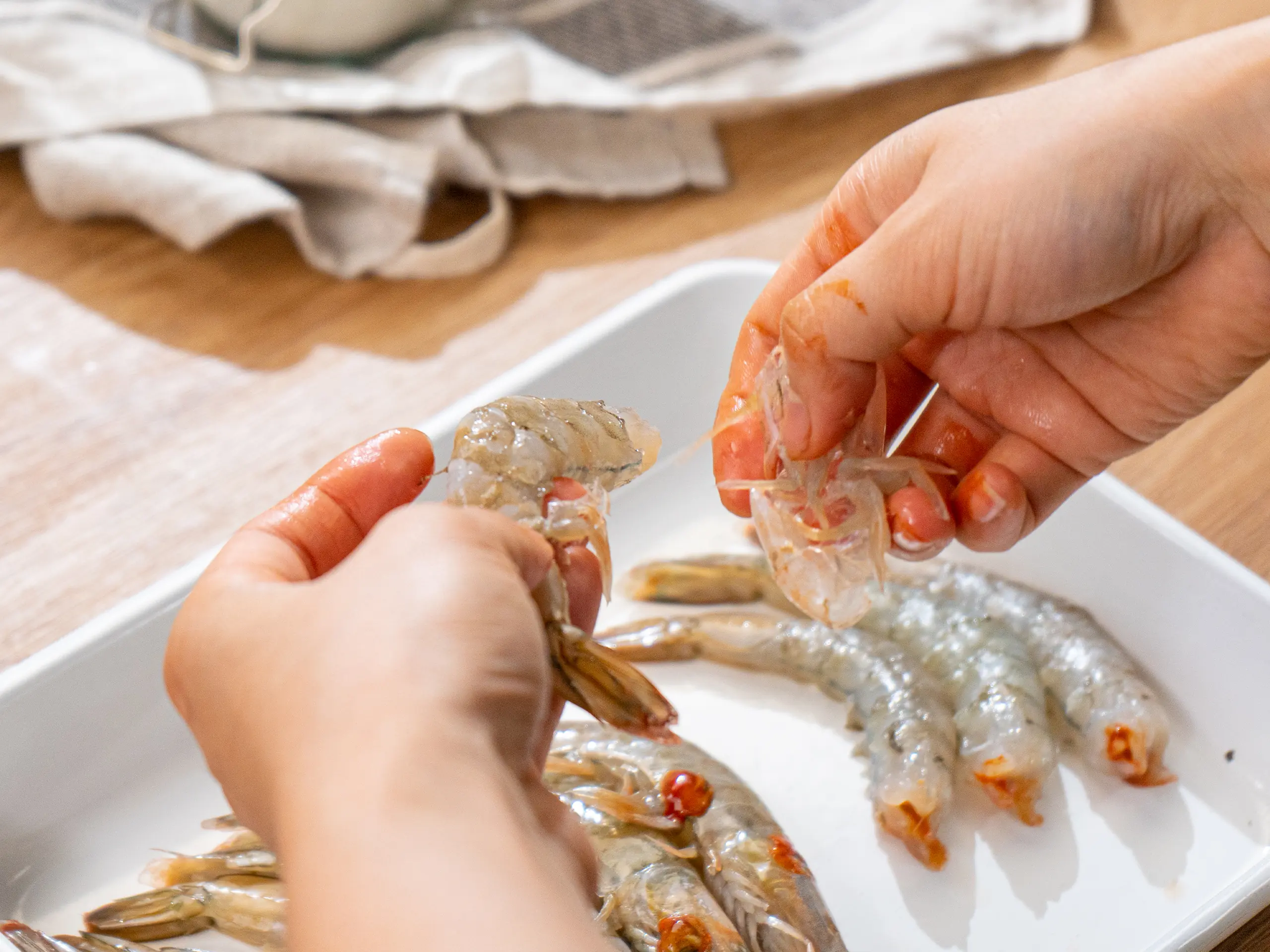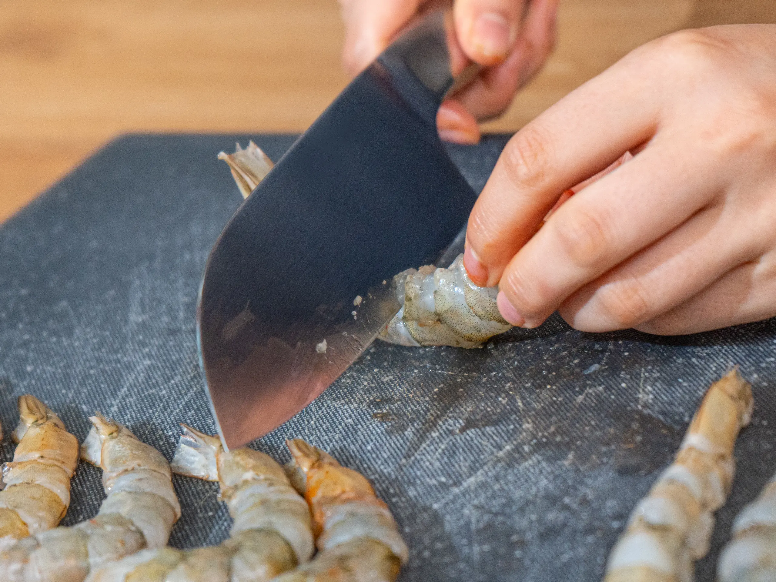Devein the back of prawns with a toothpick. Insert the toothpick sideways about 1.2-inches down from the head of the prawns and pull the toothpick up. This will lift up the vein and pull off the vein with the toothpick or by hand. If the vein is broken, then insert again a bit lower towards the tail.