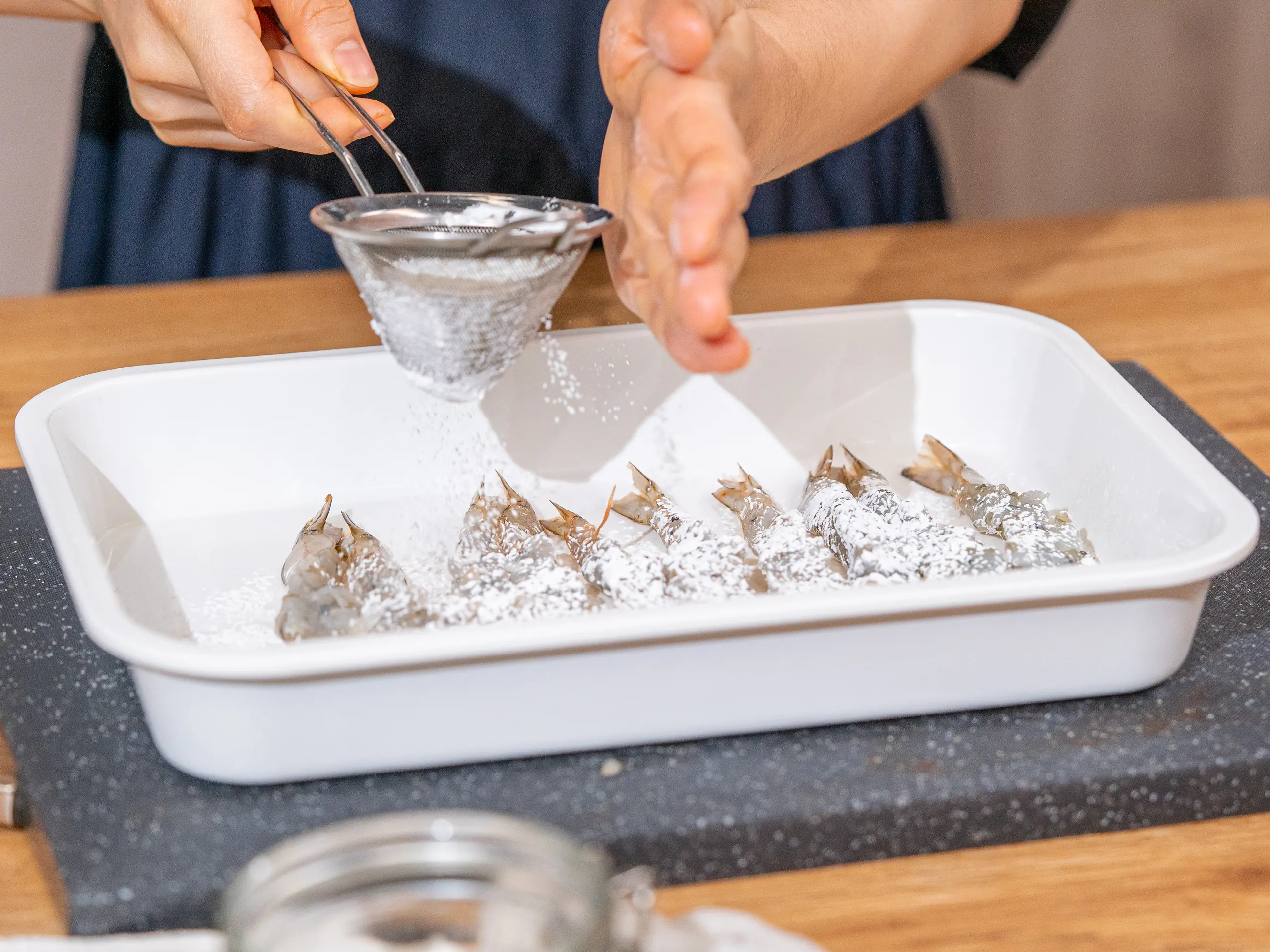 Dust the Corn Starch (as needed) over the prawns, and remove the extra starch. This will help the tempura batter adhere to the prawns.