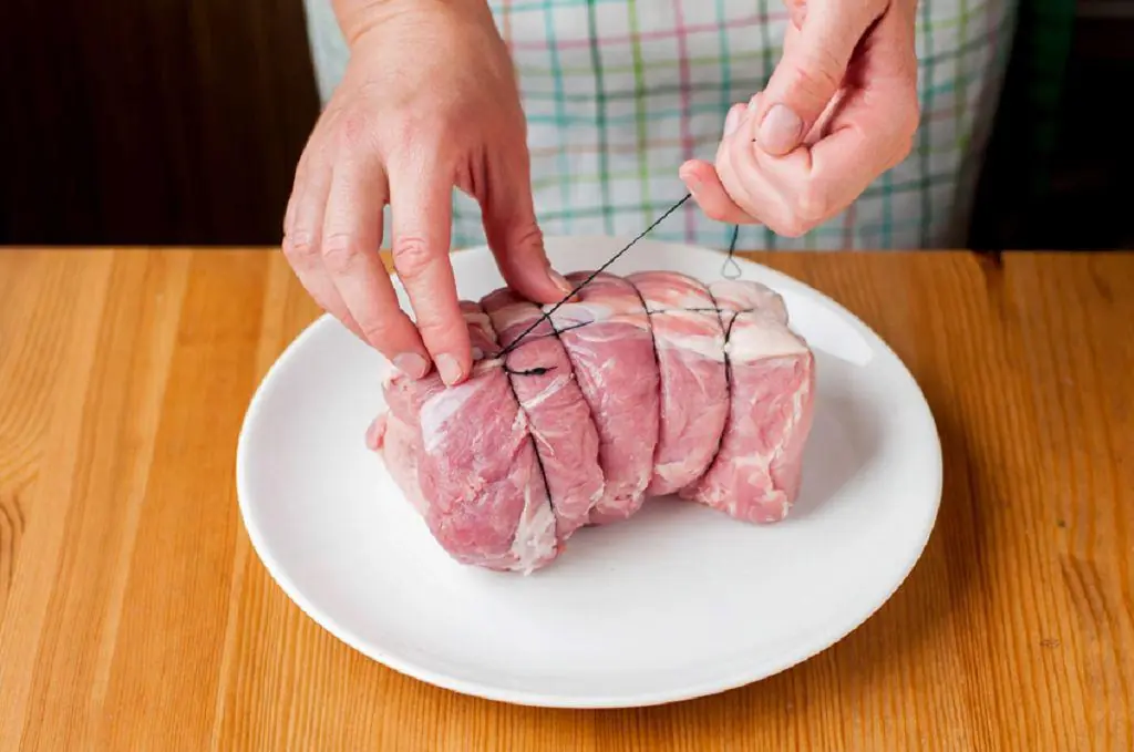 Start by tying up the Pork Shoulder (4.4 lb) with kitchen strings at intervals of 5 centimeters.