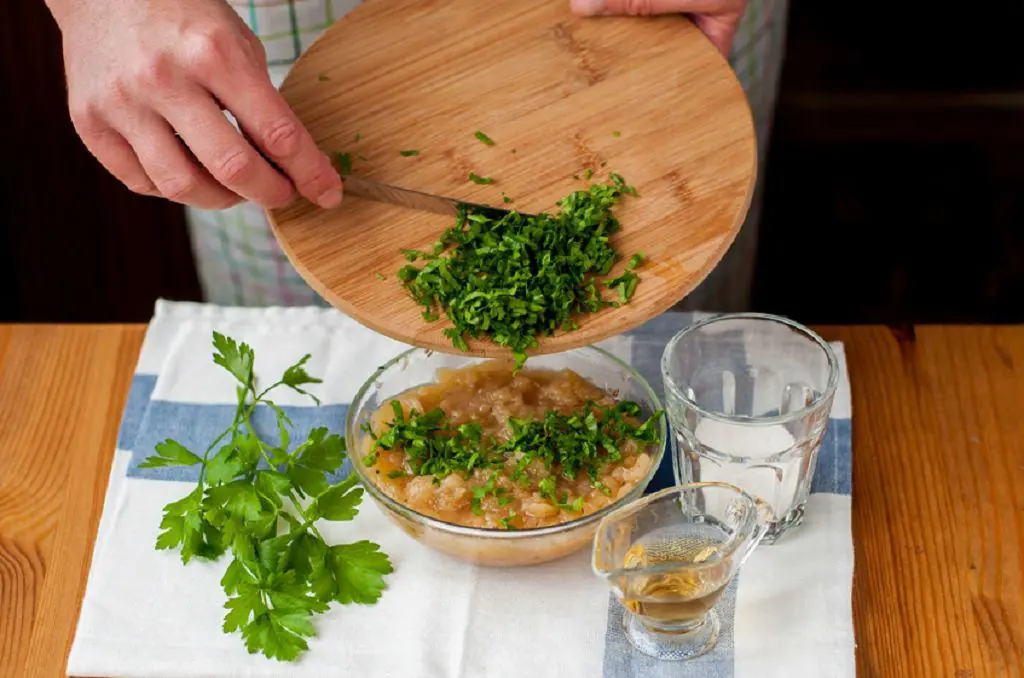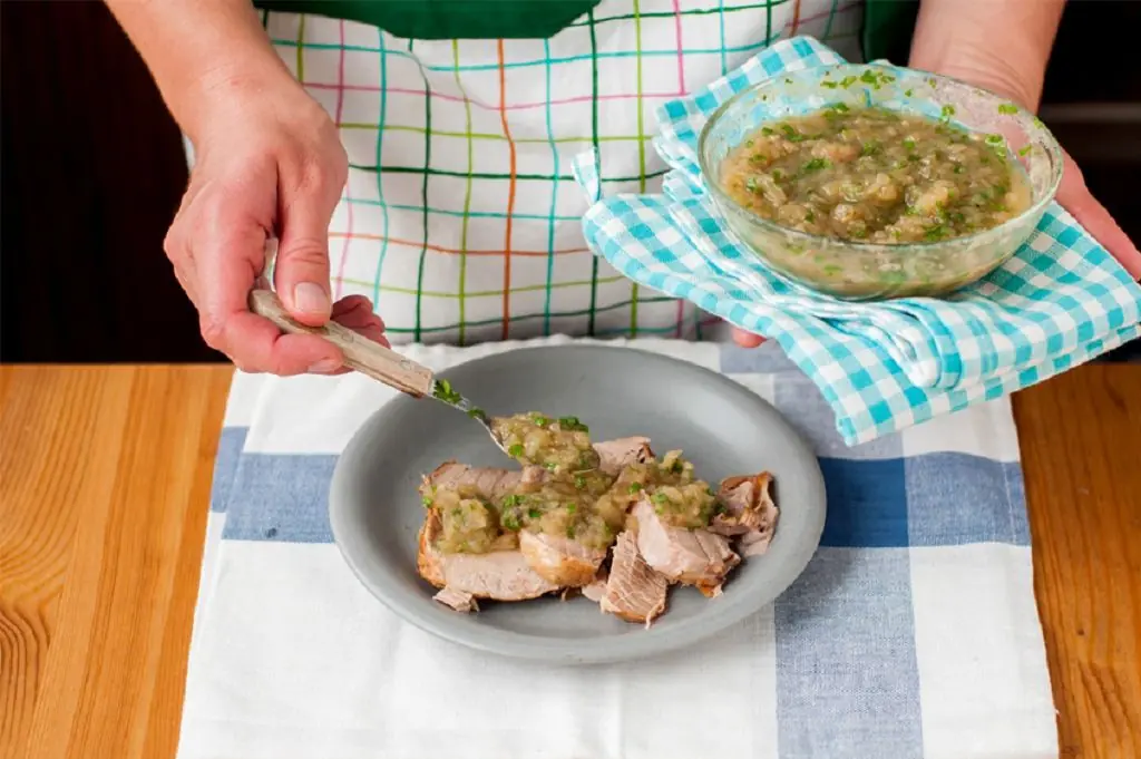 Transfer the pork to the plate. Cover it to keep warm. Then transfer the remaining apples and a quarter cup of cooking liquid to a food processor. Or use a fork to crush it.