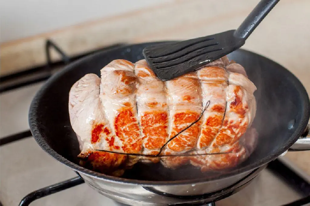 Remove and discard the string from pork. Slice and serve with apple sauce. You can also sprinkle it with sage.
