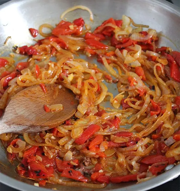 Add the Jarred Roasted Red Peppers (3/4 cup), Anchovy Fillets (2), if using, Garlic (1 1/2 Tbsp), Spanish Smoked Sweet Paprika (1 tsp), and Cayenne Pepper (1 pinch), and cook for 1 more minute, until the garlic is fragrant. Careful not to let the garlic burn!