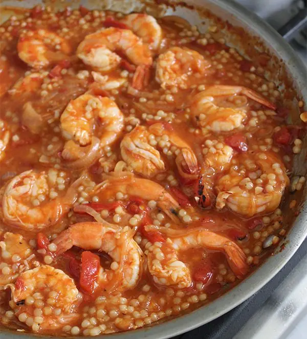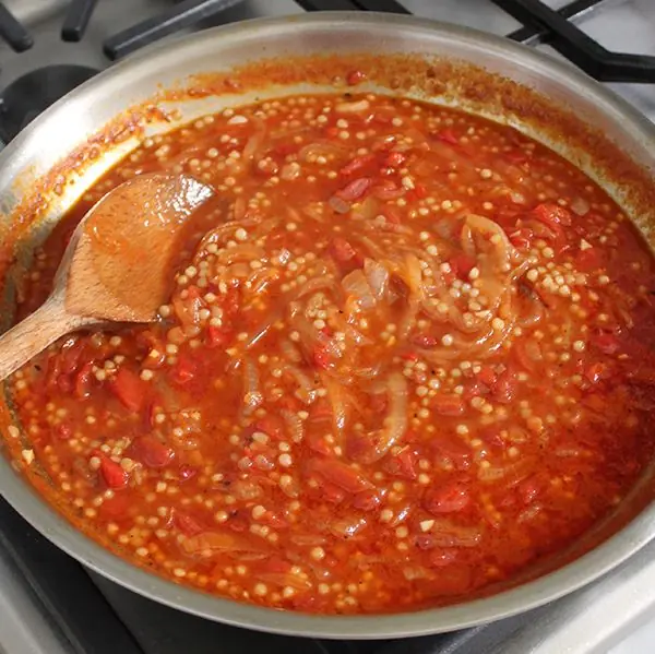 Add the Israeli Couscous (3/4 cup), reduce the heat, and simmer, stirring and scraping the bottom of the pan occasionally, until the couscous is al dente, about 6 minutes.