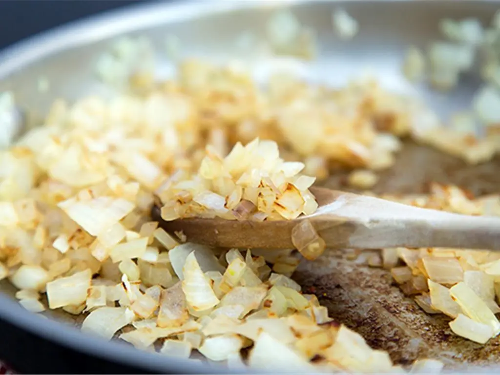 Remove the cooked squash from the oven or pot, melt the Butter (1 Tbsp) in a skillet over medium heat and saute the Yellow Onion (1/2) and Garlic (1 clove) till tender and slightly golden.