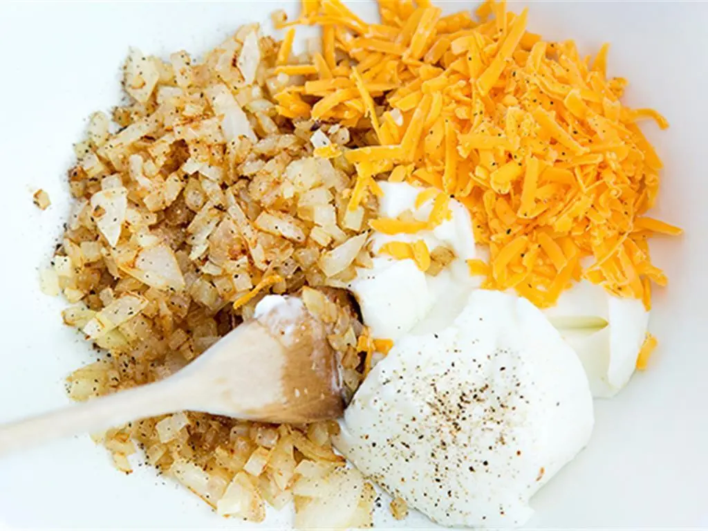 Transfer the cooked onion and garlic to a large mixing bowl, and combine with the Greek Yogurt (1 cup) and Shredded Cheese (2/3 cup), and season with Salt (to taste) and Ground Black Pepper (to taste).