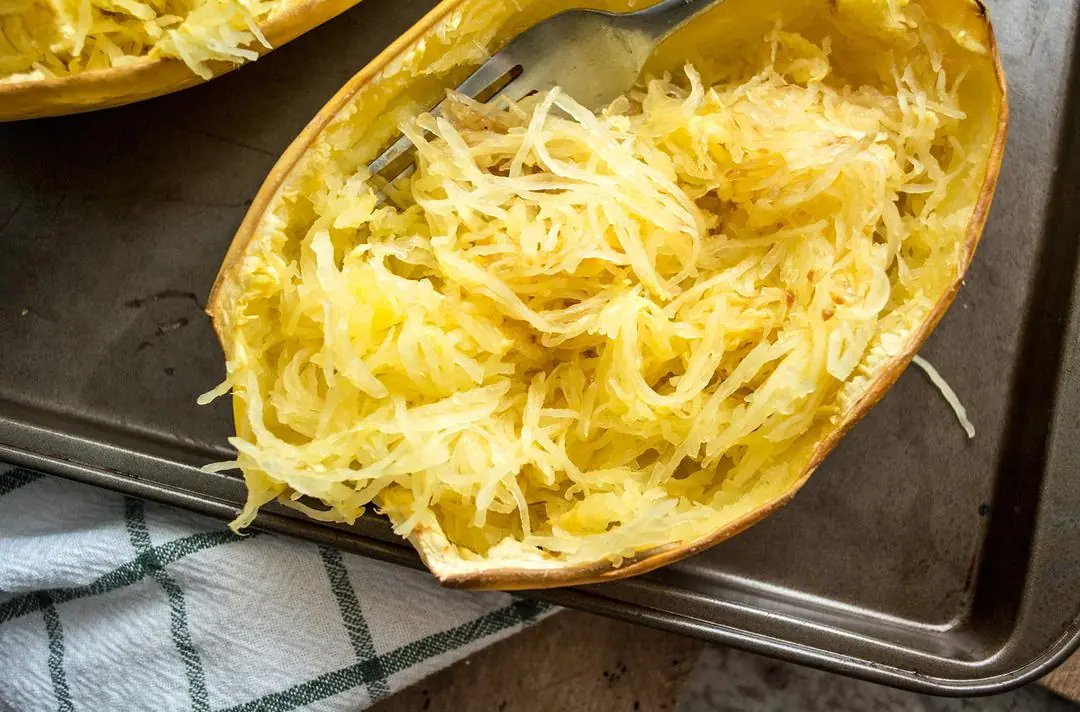 Cut Spaghetti Squash (1) lengthwise, remove seeds and add to cookie sheet faced down. Bake for 45-50 minutes or until flesh can be combed with a fork and has a pasta-like texture. Set aside to cool.