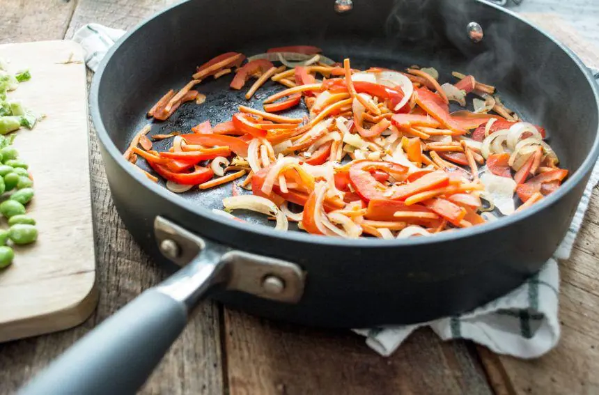 When the squash has about 10 minutes to go, add Red Bell Pepper (2/3), Sweet Onion (1/2 cup), and Carrot (1/2 cup), to a large sauté pan and cook over medium heat for 3-5 minutes.