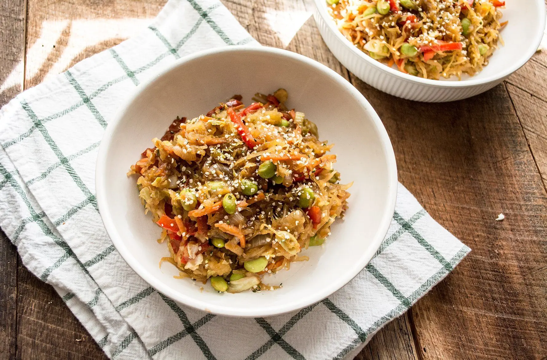 This Spaghetti Squash Veggie Teriyaki Bowl is a new favorite, both hearty and healthy, it's sure to satisfy that Chinese Takeout craving!