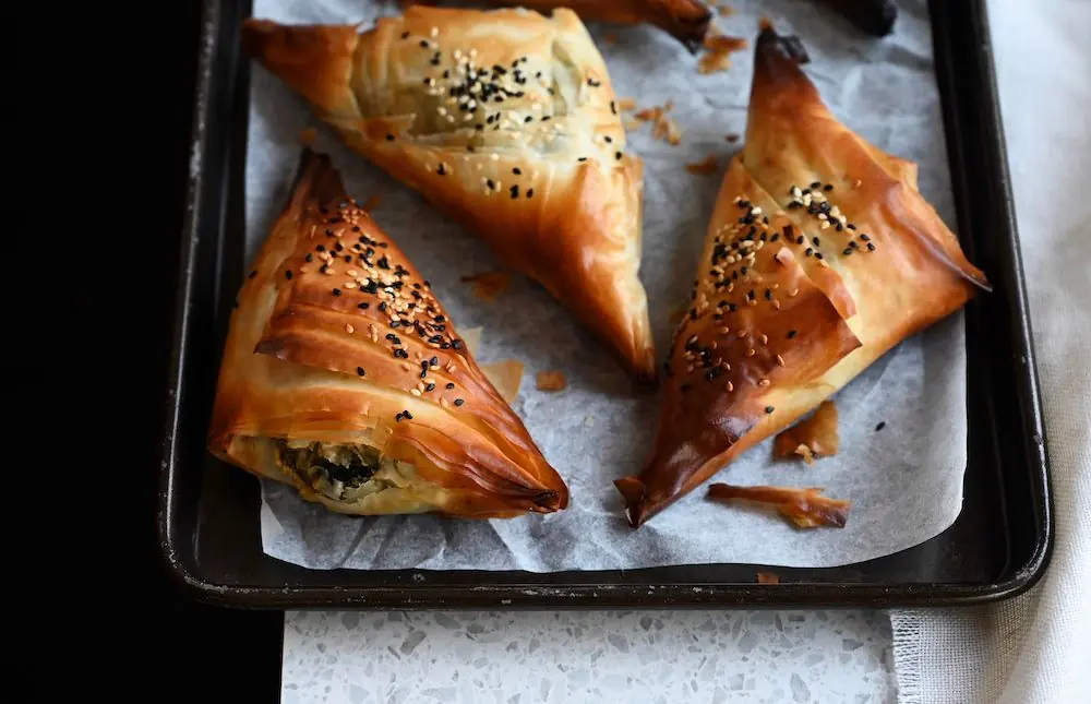 Arrange the folded spanakopita across a lined baking sheet and brush with more olive oil. Sprinkle a few Toasted White Sesame Seeds (to taste) over the top of the pies and bake for 20 to 40 minutes or until golden brown.