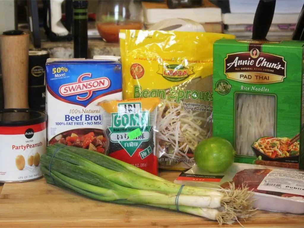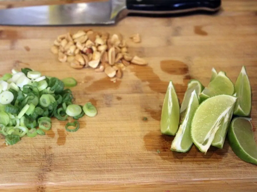 Thinly slice the Scallion (1 bunch). Cut the Lime (1) in to wedges. Chop the Peanuts (1/2 cup).