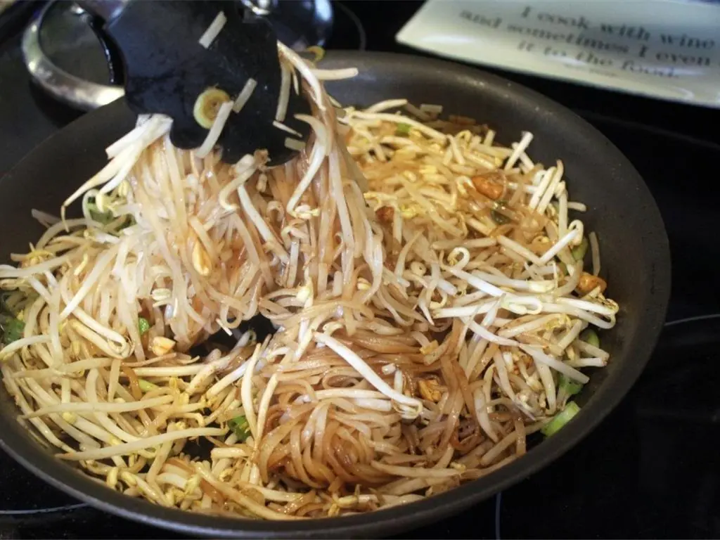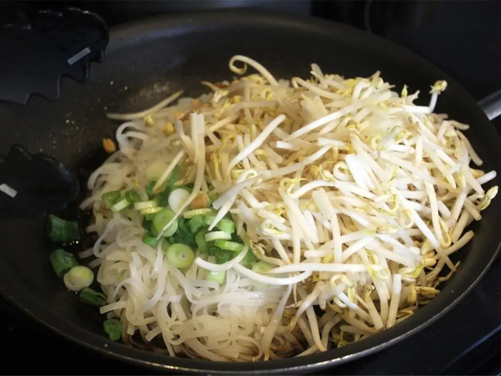 To the pan with the cooled beef sauce, add the rice noodles, scallion, Bean Sprouts (2 cups) and half of the peanuts.