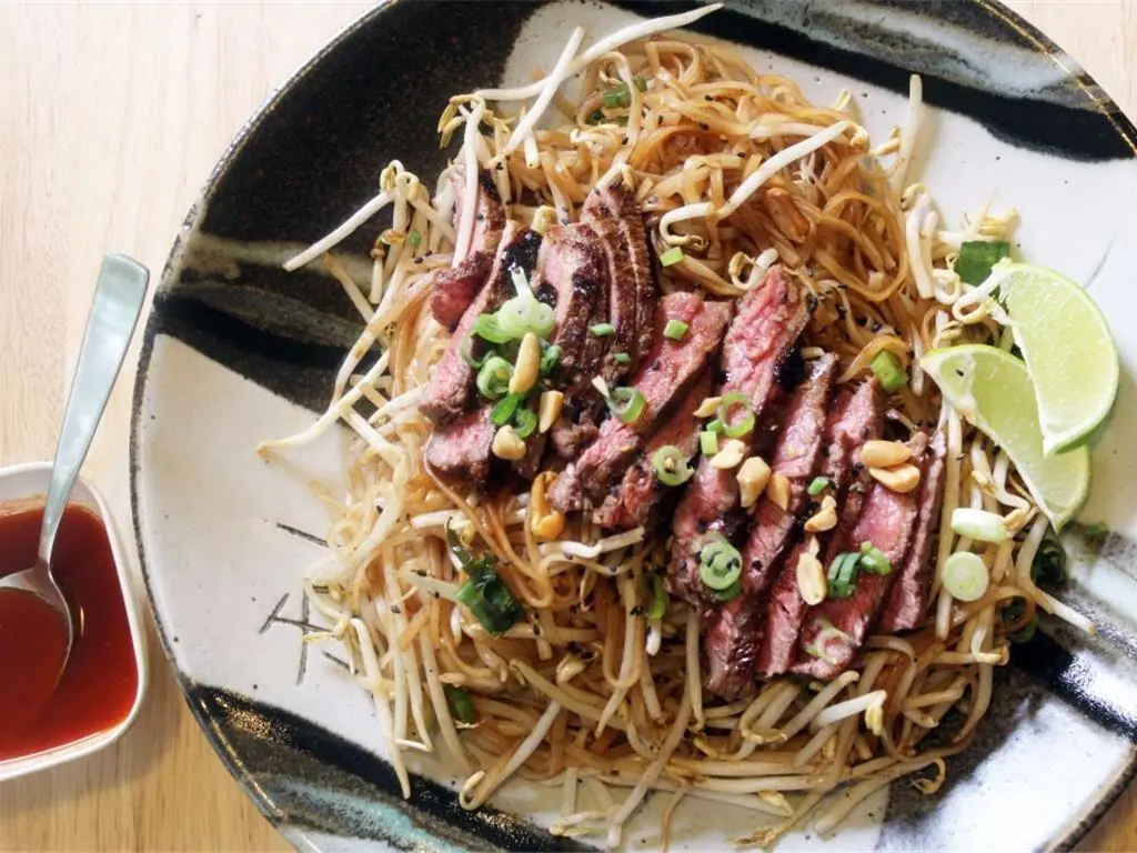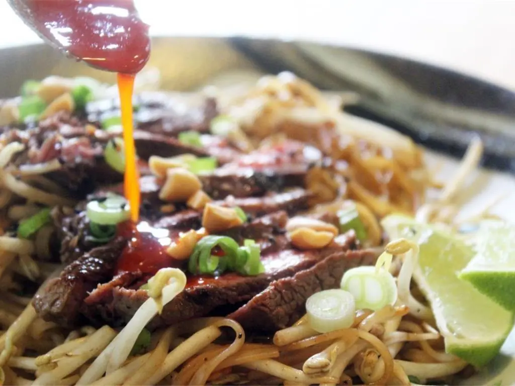 To serve, top the noodles in bowls with some of the steak, Sesame Seeds (1 Tbsp)m and lime wedges. Drizzle with hot sauce.