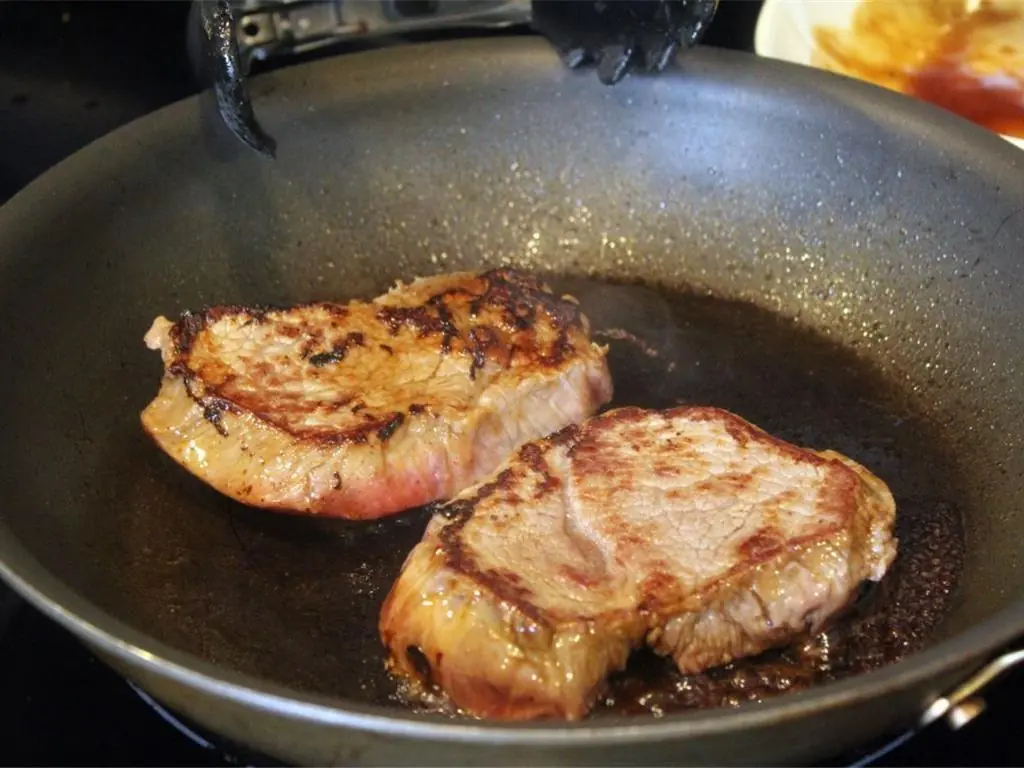 Heat a large skillet to medium-high heat with a drizzle of oil and add the steaks. The steaks should sizzle when you place them in the pan. If not, turn the heat up.