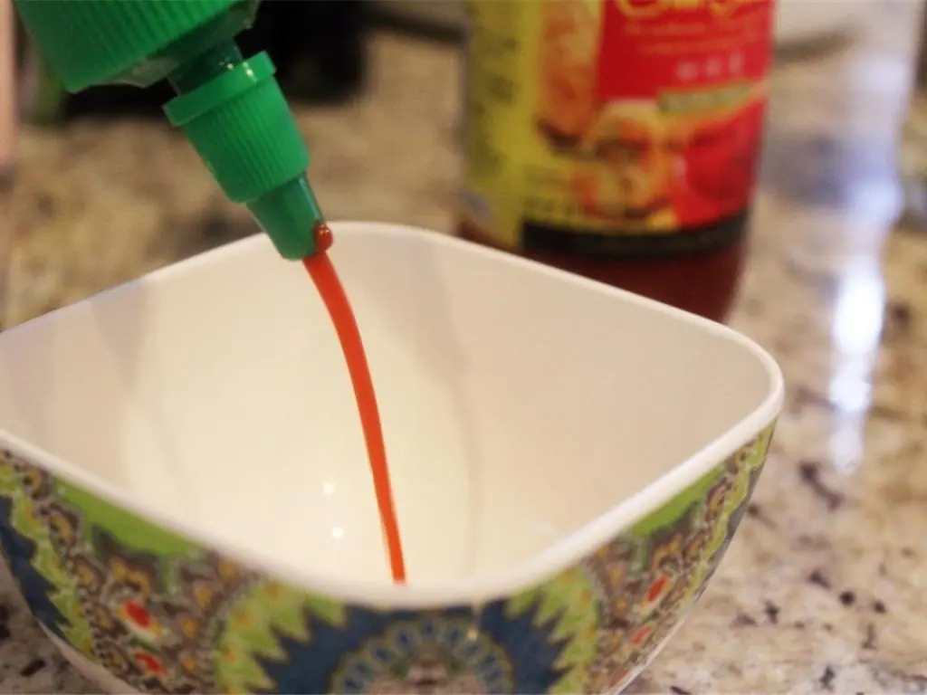 Make a spicy drizzling sauce. Add Sriracha (1 Tbsp) to a bowl. Then add the Sweet Chili Sauce (1 Tbsp) and Rice Vinegar (1 Tbsp).