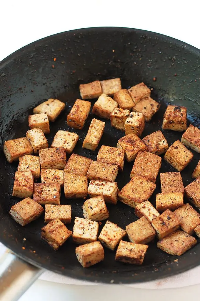 After pressing tofu, cube into 1-inch pieces. Season tofu with Taco Seasoning (1 packet).