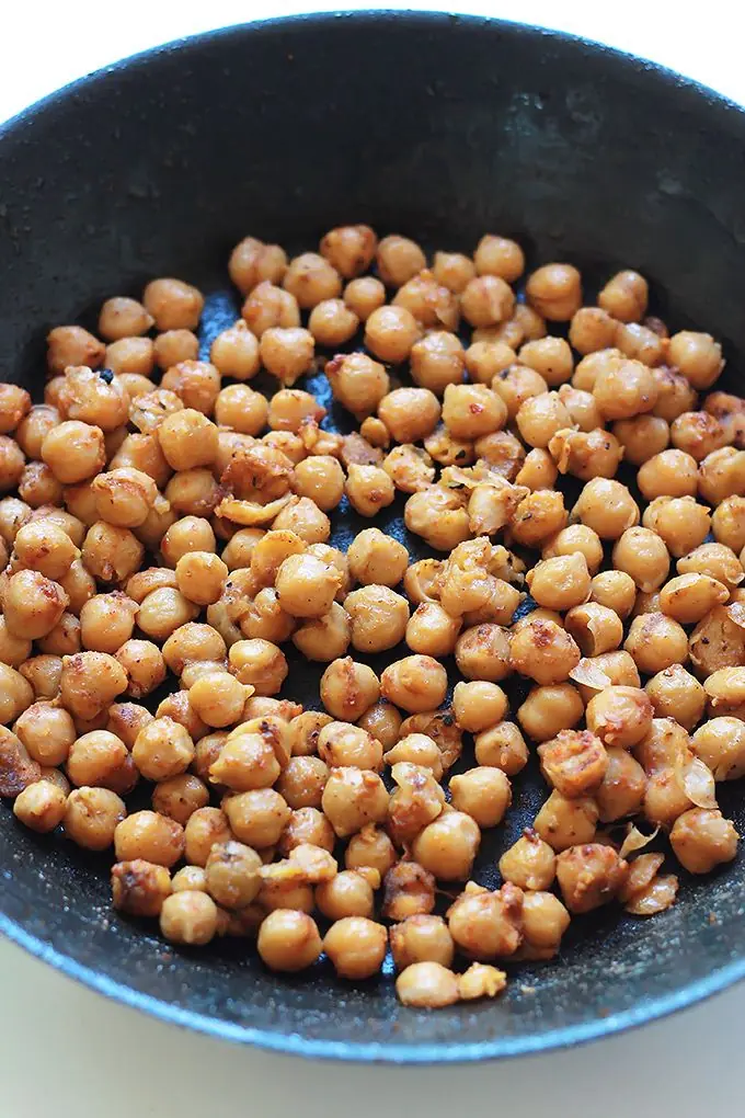 After sauteing the tofu, add a bit more oil to the pan. Add Taco Seasoning (1 packet) to the pan and sprinkle on Chickpeas (2 cans). Saute the chickpeas until well coated and heated.